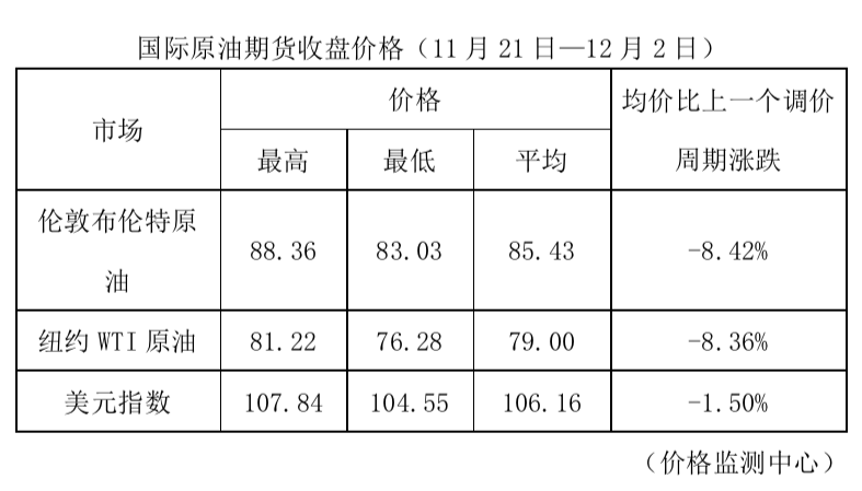 根據(jù)國家發(fā)改委消息,新一輪成品油調(diào)價(jià)窗口將于12月5日24時(shí)開啟。據(jù)國家發(fā)改委價(jià)格監(jiān)測中心監(jiān)測,本輪成品油調(diào)價(jià)周期內(nèi)(11月21日—12月2日)國際油價(jià)大幅下降。平均來看,倫敦布倫特、紐約WTI油價(jià)比上輪調(diào)價(jià)周期下降8.39%。