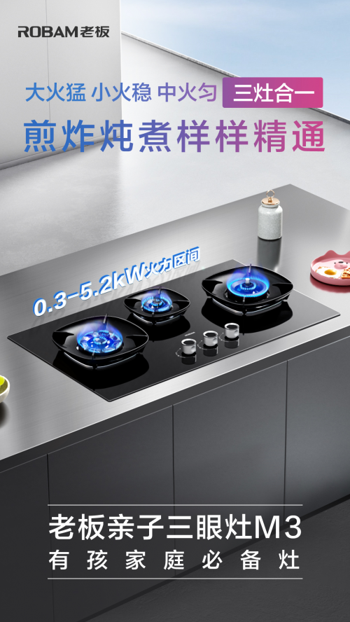 有娃家庭人口多烹飪?nèi)蝿罩?#xff0c;孩子吃的小分量食物烹飪難度大,且多代同堂對烹飪技法要求高。老板親子三眼灶M3的發(fā)布,讓眾多難題迎刃而解,烹飪變得趣味無窮,廚房生活更輕松。