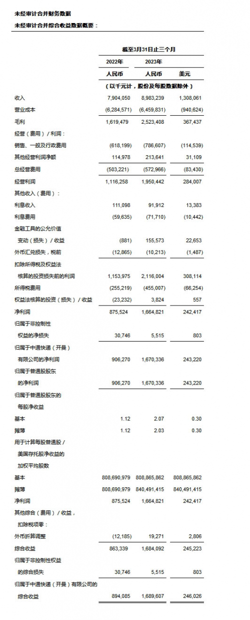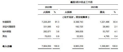 ?收入總額 為人民幣8,983.2百萬元(1,308.1百萬美元),較2022年同期的人民幣7,904.1百萬元增長13.7%。核心快遞服務收入較2022年同期增長16.1%,該增長是由于包裹量增長20.5%及單票價格下降3.7%的綜合影響所致。貨運代理服務收入較2022年同期減少41.8%,該減少主要是由于全球經濟疲弱導致跨境電商需求和定價下降所致。物料銷售收入主要由打印電子面單所需的熱敏紙銷售收入組成,同比增長30.8%,該等增長與包裹量增長趨勢吻合。其他收入主要由金融貸款業務組成。