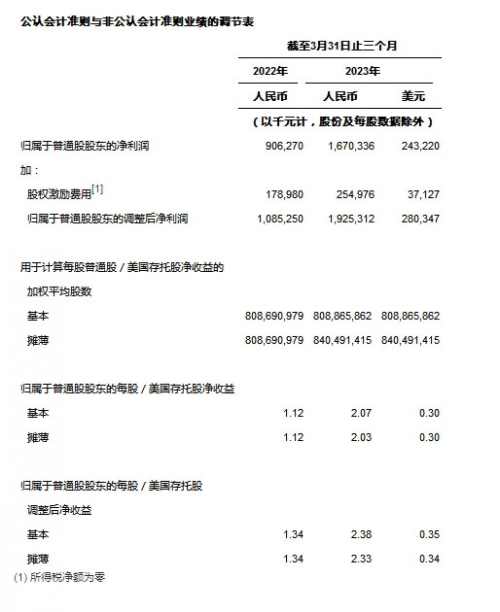 歸屬于普通股股東的基本及攤薄每股美國存托股調整后收益 為人民幣2.38元(0.35美元)及人民幣2.33元(0.34美元),去年同期為人民幣1.34元及人民幣1.34元。