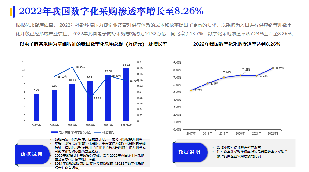《報告》測算,2022年我國企業采購規模超過173萬億元,電子商務采購總額為14.32萬億元,數字化采購率升至8.26%,我國數字化采購市場發展動力充足。