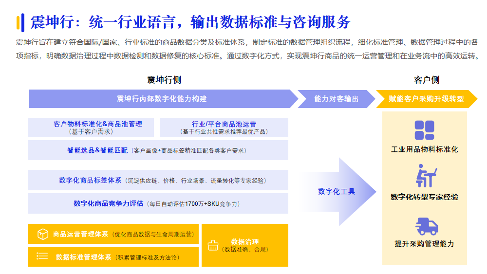 為企業提供場景、行業適配的產品與服務是供應商的基礎能力。可以借助AI等數字化技術服務,基于場景梳理的標準化實現商品智能匹配,已經成為供應商服務升級的方向。例如:震坤行通過建立國際/國家、行業標準的商品數據分類及標準體系,明確數據治理過程中數據檢測和數據修復的核心標準,再基于場景梳理,建立數字化商品標簽體系,實現震坤行商品的統一運營管理和在業務流中的高效運轉。