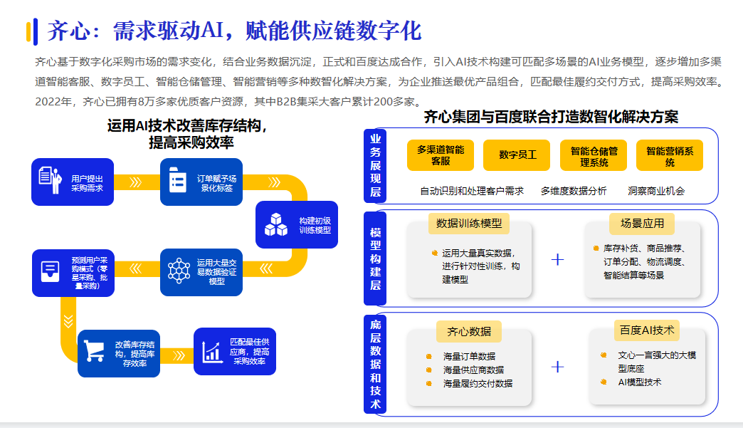 今年還有不少供應商在數字供應鏈建設方面,推出升級的智能化服務。比如,齊心引入AI技術構建可匹配多場景的AI業務模型,為企業匹配最佳履約交付方式。