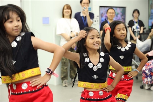 在后續的活動中,孩子們向企業志愿者們展示了他們各民族的才藝。來自佤族的孩子向志愿者們展現了傳統的甩發舞,佤族人民以長發為美,佤族姑娘們伴隨著鼓點鮮明的音樂,甩動起來的長發就像飄著的一塊塊黑綢緞,飄逸大氣,野性十足,自信展現著本民族獨特的文化魅力。來自納西族的孩子們帶著志愿者認識他們的傳統文字——東巴文,這是世界上唯一一種還在使用的象形文字,距今已有1200多年的歷史。志愿者們借助形象的圖像表達認識了東巴文中的十二生肖動物文字,并和孩子們一起體驗“東巴十二生肖”桌游,在充滿民族文化內涵的益智游戲中,沉浸式感受納西族的智慧。各族青少年和企業志愿者們玩鬧在一起,活動會場內回蕩著大家的歌聲、笑聲。