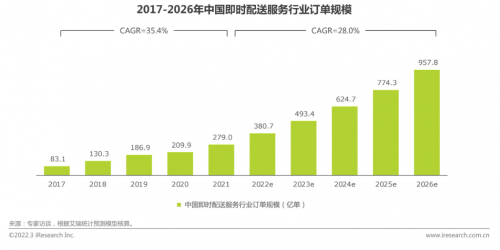 據(jù)艾瑞咨詢《2022年中國(guó)即時(shí)配送行業(yè)報(bào)告》顯示,2021年,即時(shí)配送服務(wù)行業(yè)訂單規(guī)模為279億單。未來(lái)伴隨即時(shí)配送服務(wù)價(jià)值進(jìn)一步凸顯,預(yù)計(jì)2026年,即時(shí)配送服務(wù)行業(yè)訂單規(guī)模將接近千億量級(jí) ,達(dá)到957.8億單,2021年-2026年年復(fù)合增速為28.0%,行業(yè)整體仍處于快速發(fā)展路線上。