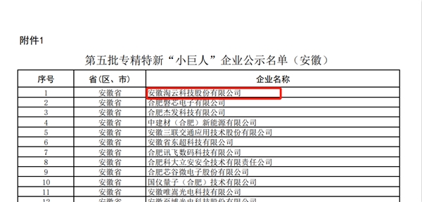7月21日,工業和信息化部開展的第五批專精特新“小巨人”企業公示結束。安徽淘云科技股份有限公司(后稱“淘云科技”)憑借企業在專業、精細、特色、創新等核心競爭力領域的出眾表現,從眾多參選企業中脫穎而出,成功獲得第五批國家級專精特新“小巨人”的認定!