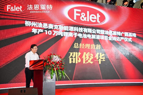 儀式上,法恩萊特邵俊華總經理在致辭表示:柳州法恩賽克項目不僅是法恩萊特在華南區域作出的重大戰略部署,更是法恩萊特面向全球布局的重大舉措。法恩萊特將以此次項目全線達產為新的起點,發揮公司的技術、戰略、規模和品牌等優勢,深耕細作新能源鋰電池行業材料電解液市場,深化新能源鋰電池行業更大范圍、更寬領域的務實合作,為新能源汽車、儲能系統、消費電池客戶提供更具優勢、更高性能的超級鋰電池電解液解決方案,為新能源行業的持續創新貢獻更多力量。