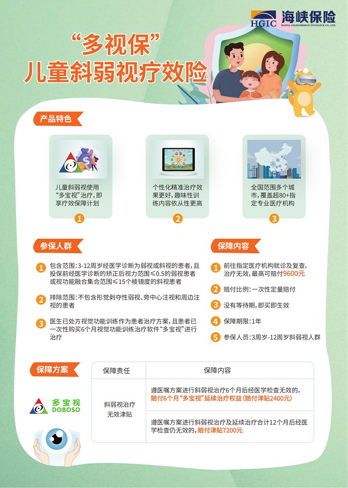 弱視和斜視作為兒童眼科的常見疾病,是導致兒童視覺障礙的主要原因,不僅影響兒童的正常視覺功能,對生活學習造成困擾,甚至影響未來的工作能力,孩子一旦診斷為斜弱視應及早診治。然而,受到斜弱視本身治療周期長、收效慢、易復發、治療花費多等特點的影響,對于孩子斜弱視的治療,許多家長顧慮重重,治療信心也不足,可能更有甚者會因為錯誤的認知或者為了單純省錢而選擇了不適宜孩子實際病情的治療方法,最后耽誤了孩子病情,悔之晚矣。那么是否有一款專門針對兒童斜弱視的產品,既可以有效治療疾病受到專家權威認可,又可以讓孩子開心愉悅治療提高依從性,還可以對治療效果進行保駕護航呢?相信這是絕大多數斜弱視患兒家長心中一直期待的完美方案,現在“多視保”的橫空出世終于讓家長們的期待夢想成真。視景醫療一直堅持“以患者為中心,以療效為導向”的初心,攜專業團隊與海峽保險共同推出全球商保領域首個兒童斜弱視療效險產品“多視保”,為我國兒童斜弱視患者及家庭帶來更好的治療保障選擇。