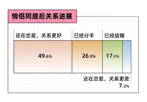 例如,此次的調查數據顯示,AA制正在成為年輕情侶分攤房租的主流方式。此外,從調查結果來看,超4成年輕人同居后的性生活達到1周2-3次。同居生活對情侶關系的改善超出了很多人的預期。