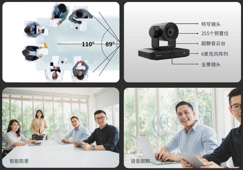 攝像系統由12倍光學變焦特寫鏡頭和110°大廣角的全景鏡頭組成,特寫鏡頭可視角達89°,可將畫面無損放大至12倍,加上自動對焦,不僅能捕捉所有參會人的表情和動作,會議室中的文件和白板內容都能在遠端輕松觀看。同時,作為一款會議云臺攝像頭,它能通過6顆麥克風陣列,鎖定發言人位置,電機實時穩定安靜快速地運行轉動到當前發言人,覆蓋會議室多個角度,讓遠程的參會人更具沉浸感和參與感。