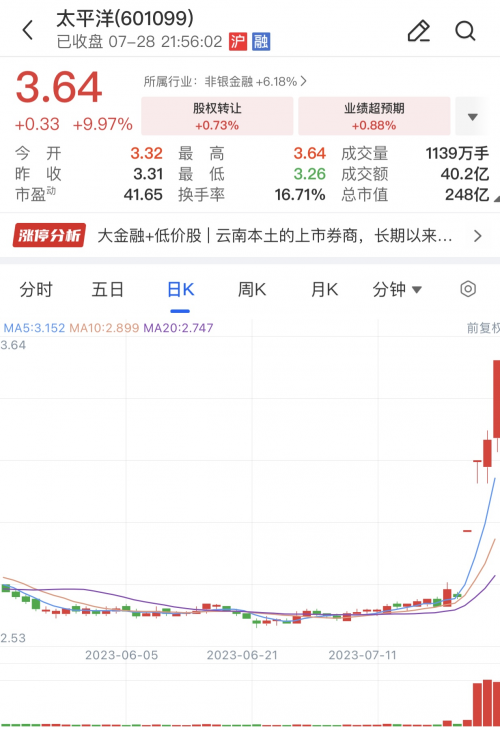 7月28日,太平洋證券再次漲停,截至收盤,成交40.24億元,換手率為16.71%,買一封單107.42萬手,以當日收盤價3.64元計算,約3.91億元。太平洋錄得“四天三漲停”,近4個交易日上漲36.84%,累計成交118.93億元。最新總市值為248.1億元,較7月23日收盤市值增加66.8億元。