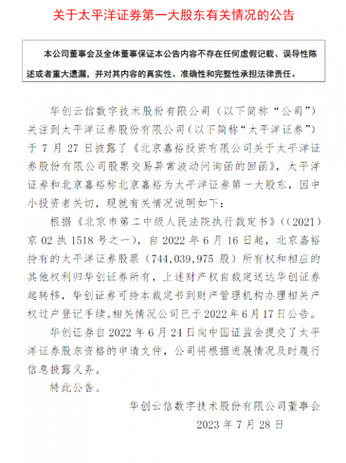 7月28日,華創(chuàng)云信發(fā)布公告稱,根據法院執(zhí)行裁定書,自2022年6月16日起,北京嘉裕持有的太平洋證券股票7.44億股所有權和相應的其他權利歸華創(chuàng)證券所有,上述財產權自裁定送達華創(chuàng)證券起轉移,華創(chuàng)證券可持本裁定書到財產管理機構辦理相關產權過戶登記手續(xù)。