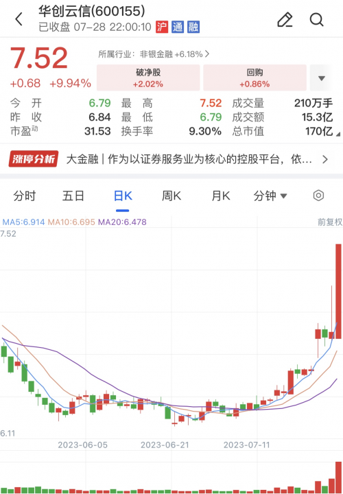 作為太平洋證券7.44億股股權的收購方,華創(chuàng)證券母公司華創(chuàng)云信(原華創(chuàng)陽安)同樣出現(xiàn)大漲,截至28日收盤,日內成交15.28億元,換手率為9.3%,買一封單為9.23萬手,近4個交易日累計上漲14.81%,最新市值為170.06億元。