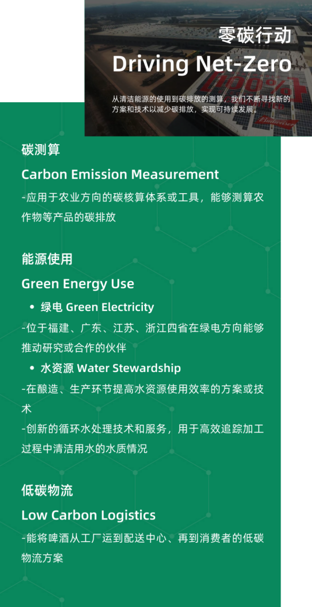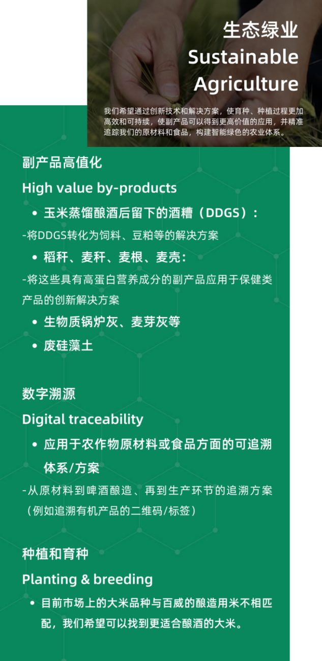 每一年,100+創新中心都會在價值鏈上梳理亟待解決的可持續發展挑戰議題并公開招募創新解決方案,目標是讓你的想法得到驗證并實現商業化應用,在試點完成后能夠獲得更大的商業合同,與百威中國以及更多伙伴建立強有力的合作。
