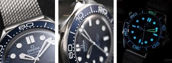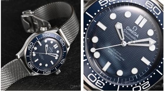 海馬300米“詹姆斯·邦德60周年紀念款”表盤為波浪紋,帶有“棒棒糖”秒針