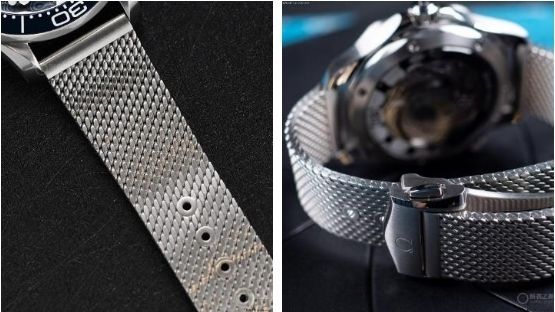 海馬300米“詹姆斯·邦德60周年紀念款”腕表可配備網狀表鏈或者NATO表帶。自從2019年,歐米茄海馬300米“007無暇赴死”開始,網狀表鏈和NATO表帶開始進入到海馬300米系列中。特別是網狀表鏈和海馬300米表頭組合,在增強復古風格的同時,已經成為了歐米茄海馬300米特殊款的一大特征,具有極高的識別度。