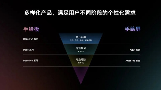 目前,XPPen 共有 2 大品類,5 大系列產(chǎn)品,包括數(shù)位板類的 Deco Fun、Deco、Deco Pro 系列及數(shù)位屏類 Artist、Artist Pro 系列產(chǎn)品。其中,Deco Fun 產(chǎn)品線系列面向多元樂(lè)趣用戶;Deco 和 Artist 產(chǎn)品線系列面向?qū)I(yè)學(xué)習(xí)用戶;Deco Pro 和 Artist Pro 產(chǎn)品線系列面向?qū)I(yè)進(jìn)階用戶。全新的產(chǎn)品布局,可針對(duì)不同成長(zhǎng)階段的用戶需求,打造從興趣入門到專業(yè)學(xué)習(xí)再到專業(yè)進(jìn)階的產(chǎn)品矩陣。