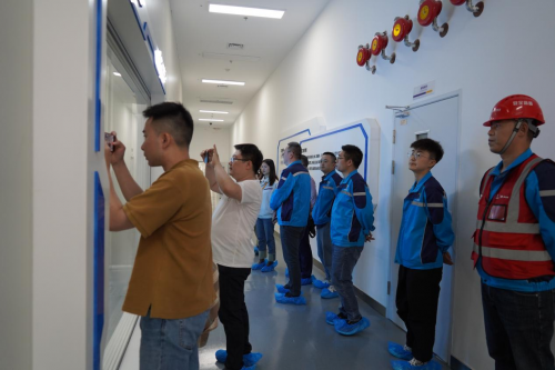 隨后,在項目團隊的帶領下,媒體嘉賓們走進施工一線,深入了解遂寧蜂巢能源項目施工建設歷程,感受寶冶“建精品工程、鑄長青基業”的企業使命。在已完工的1#綜合樓,項目經理講解了1#建筑功能及周邊海綿城市應用情況,隨后經過2#中試線,為大家介紹了廠房建筑特點及2#中試線工藝功能,在5#建筑電極及裝配車間的參觀通道內,記者們與項目管理團隊探討交流了相關廠房建筑特點及工藝流程,最后經4#化成車間出廠區。