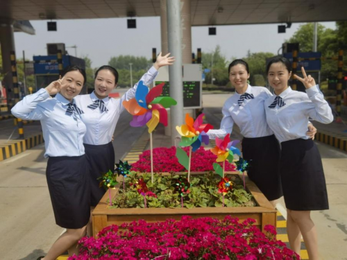 在收費現場,工作人員正在為節假日的流量高峰時刻忙碌著。增派人手,開足道口;加大收費廣場和綠化帶的清潔工作,在安全島增加時令花卉,營造花團錦簇的節日氛圍,同時車道周邊布滿五彩繽紛的風車迎風旋轉,更加提升了收費站的顏值。廣場上,最美路姐團隊搭建的便民服務臺格外