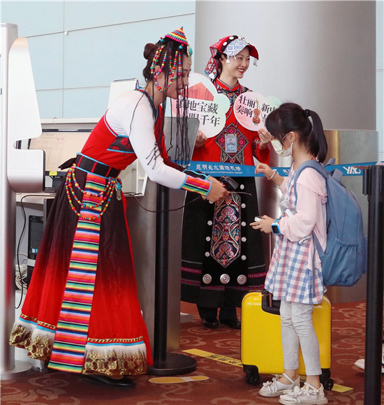 首航當(dāng)天,東航工作人員身著少數(shù)民族服裝,用親切的民族方言向旅客問(wèn)好,引導(dǎo)旅客辦理乘機(jī)手續(xù)。主題航班專屬柜臺(tái)前,頗有云南歷史文化元素的海報(bào)引得旅客駐足觀看,“媽媽,這是我們?cè)谖麟p版納看到過(guò)的孔雀嗎?”“哇,你看,這是大鵬金翅鳥(niǎo),我在云南省博物館見(jiàn)到過(guò)。”小旅客從辦理值機(jī)就開(kāi)始期待這趟精彩的空中博物館之旅。