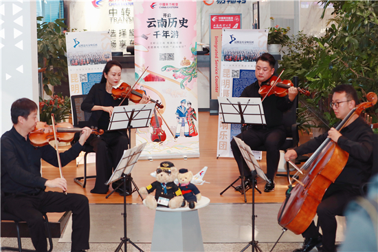 值得一提的是,中國(guó)唯一一支以人民音樂(lè)家“聶耳”命名的交響樂(lè)團(tuán)——昆明聶耳交響樂(lè)團(tuán),在主題航班首航儀式活動(dòng)現(xiàn)場(chǎng),用專業(yè)、優(yōu)雅的演奏,帶領(lǐng)旅客走進(jìn)云南,靈動(dòng)的音符、悅耳的曲調(diào)贏得了旅客的稱贊與掌聲。