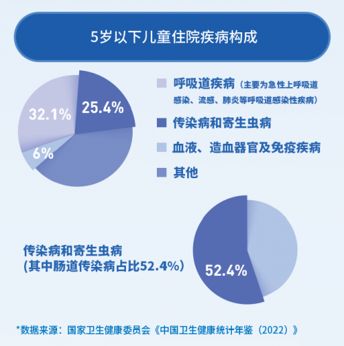 調(diào)查報告也顯示,0-14歲兒童住院病人中,5歲以下兒童占比65%,而住院疾病構(gòu)成中,呼吸系統(tǒng)疾病和腸道傳染病總體占比近50%,為住院疾病負擔(dān)主因。如何提高兒童免疫力,成了保障兒童健康的關(guān)鍵因素。