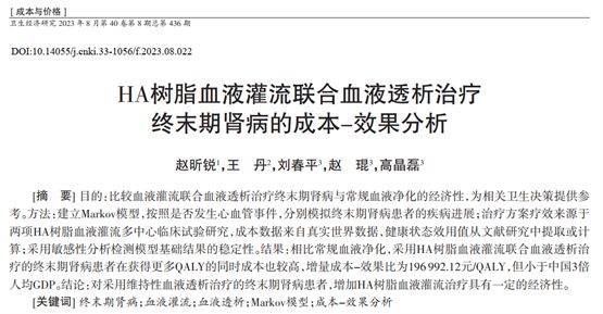 8月1日,國家衛生健康委衛生發展研究中心、國家藥物與衛生技術綜合評估中心趙琨研究員等的研究成果《HA樹脂血液灌流聯合血液透析治療終末期腎病的成本-效果分析》發表于《衛生經濟研究》雜志。