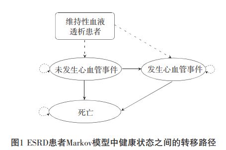 研究采用Markov模型法,將模型結構分為未發生心血管事件(NCVD)、發生心血管事件(CVD)、死亡(death)三個獨立狀態,模擬接受常規血液凈化以及聯合HA樹脂血液灌流的ESRD患者疾病進程,計算接受不同治療方案患者的疾病成本與質量調整壽命年(QALY)。模型循環周期為26周,研究時限為終生,評估不同治療方案患者的疾病成本與質量調整壽命年。