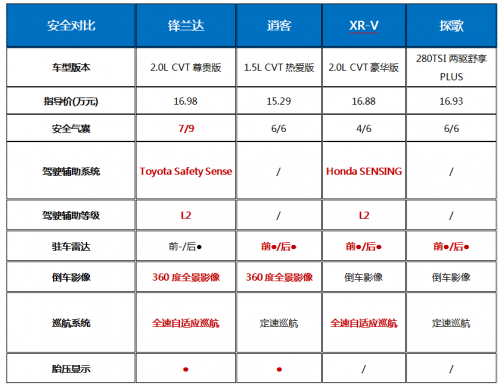 而在主動安全配置上,四款車型中僅有2款提供了選擇,分別為鋒蘭達搭載的T-PILOT智能駕駛輔助,以及XR-V的Honda SENSING駕駛輔助系統,兩車的功能性方面均滿足L2級的自動駕駛。并且兩車的主動安全都近乎實現全系標配,這也讓購車的消費者不用過多在主動安全以及更高的預算上左右為難。