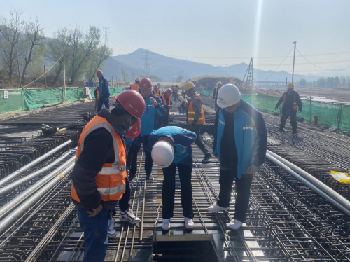 在濱河北路鐵路下穿段施工現場中,工程建筑者們堅守工作崗位,克服工程障礙,精心組織施工計劃,以多點聯動方式快速推進項目建設,加班加點抓工期、趕進度,有的綁扎鋼筋籠,有的正在進行鋼筋籠焊接,一派繁忙的施工景象。