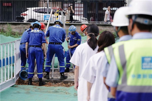 項目聯合青島紅十字藍天救援隊、嶗山區衛生健康局,現場模擬開展對管廊內中毒窒息人員和基坑坍塌被埋人員救援演練。