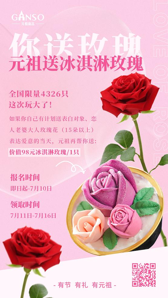 你送玫瑰,元祖送冰淇淋玫瑰,全國限量4326只!如果你有計(jì)劃送表白對(duì)象、戀人、妻子玫瑰花(15朵以上)表達(dá)愛意,元祖當(dāng)天再幫你送價(jià)值98元冰淇淋玫瑰。此活動(dòng)一經(jīng)發(fā)布,元祖粉絲紛紛報(bào)名參與,迅速在社交媒體上掀起了一股“浪漫熱潮”!