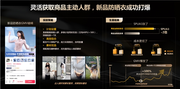 某防曬衣品牌正是直擊商品粒度的主動(dòng)人群,搭配高完播率素材,將新品防曬衣成功打爆。SPUA3漲了2倍,新品GMV增長(zhǎng)超過(guò)100%,突破歷史峰值。