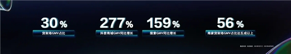 2023抖音電商生態(tài)大會(huì)數(shù)據(jù)顯示:從2022年5月1日至今年4月30日抖音商城中,貨架場(chǎng)GMV占比達(dá)到30%,搜索的GMV同比增長(zhǎng)159%,有56%的商家貨架場(chǎng)GMV占比超過(guò)50%。