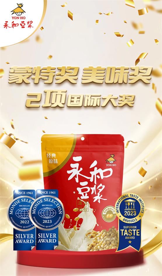 40年品質經營,永和食品多次榮獲全國產品和服務質量誠信示范企業、全國質量檢驗信得過產品等榮譽稱號,2022-2023年,350g經典原味豆漿粉更是連續2次榮獲世界食品品質評鑒大會大獎,并與純豆漿粉一起斬獲ITI國際美味獎,品質實力國際彰顯。