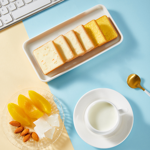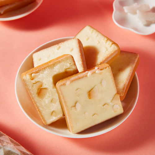 更讓人驚喜的,除了原有的原味、抹茶味、檸檬味等口味,梅尼耶干蛋糕又新研發出了添加真實黃桃果粒黃桃味、添加椰子片的椰子味以及含有巴旦木片的巴旦木味三種口味。 “老婆餅”里不一定有“老婆”,梅尼耶干蛋糕的新口味里可有真材實料噢!