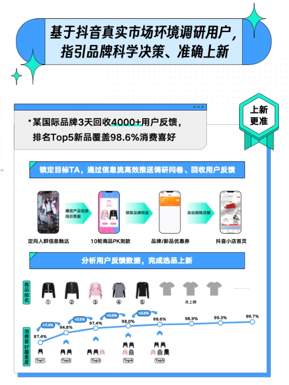 某國際服裝品牌在選品上新時(shí)使用巨量云圖“新品實(shí)驗(yàn)室”的測(cè)品能力,僅用時(shí)三天就回收了超過4000份目標(biāo)用戶反饋,選出的貨品,也成為后續(xù)品牌直播間銷量冠軍,為店鋪GMV的主力貢獻(xiàn)商品。獲得這樣的上新成績(jī)是因?yàn)榫蘖吭茍D在測(cè)品的每個(gè)細(xì)節(jié)都試圖降低誤差,從而最大程度還原消費(fèi)者真實(shí)意愿。