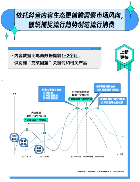 看似無序的消費(fèi)決策遵循一套基礎(chǔ)邏輯,比如購買普遍發(fā)生在瀏覽和搜索之后。所以,內(nèi)容數(shù)據(jù)和搜索數(shù)據(jù)可以被視為交易的前置指標(biāo),它們能夠更早預(yù)測(cè)未來交易走向。正是基于這一結(jié)論,擁有內(nèi)容場(chǎng)監(jiān)測(cè)能力的巨量云圖能更快識(shí)別出新品市場(chǎng)機(jī)會(huì),為品牌上新提供參考。
