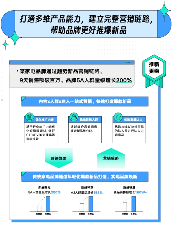 如果說前期洞察和測(cè)品是成功的基石,那么能否應(yīng)對(duì)上市后的這些問題,決定了新品可否走好成功前的最后一里路。在「新品C位出道指南」中,巨量云圖場(chǎng)景運(yùn)營模塊下的「趨勢(shì)新品營銷」等功能讓品牌推新更穩(wěn)健。