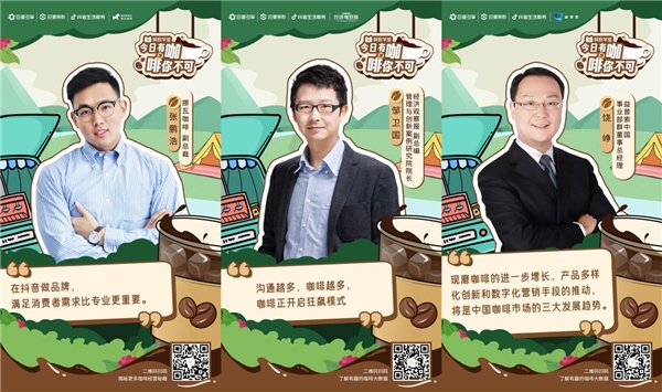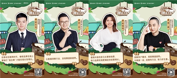 為此《算數學堂》重磅推出《今日有咖·啡你不可》欄目,聚焦咖啡賽道,為品牌商家們指點迷津,并邀請了8位重磅嘉賓,專業覆蓋咖啡生態各個環節,包括消費行業專家2位、咖啡品牌商家代表2家、品牌代理服務商1家、抖音生活服務專家2位、巨量引擎商業分析1位,他們將分別從各自的領域出發,分享有關咖啡行業未來趨勢、品牌經營方法論、抖音平臺數字化營銷秘籍等真知灼見。