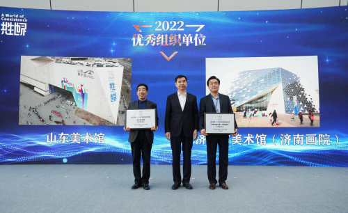 劉斯杰為山東美術館、濟南市美術館(濟南畫院)兩家優(yōu)秀組織單位頒發(fā)了獎牌。