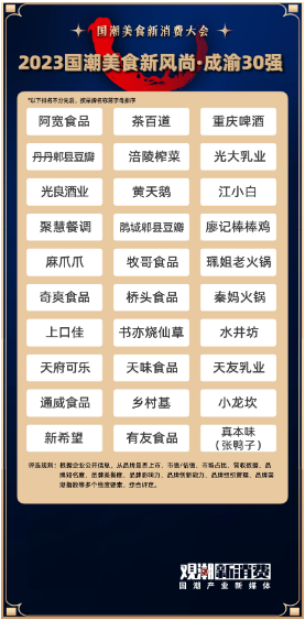 國潮品牌之夜是一場專屬中國美食品牌的加冕之夜。在借由盛典彰顯國潮美食風尚之余,觀潮新消費還發(fā)布了《2023國潮美食新風尚·成渝30強》,旨在打造成渝核心企業(yè)標桿,描繪區(qū)域食品工業(yè)發(fā)展藍圖,為進一步推動企業(yè)創(chuàng)新、深化產業(yè)合作、實現成渝經濟高質量發(fā)展提供參考。