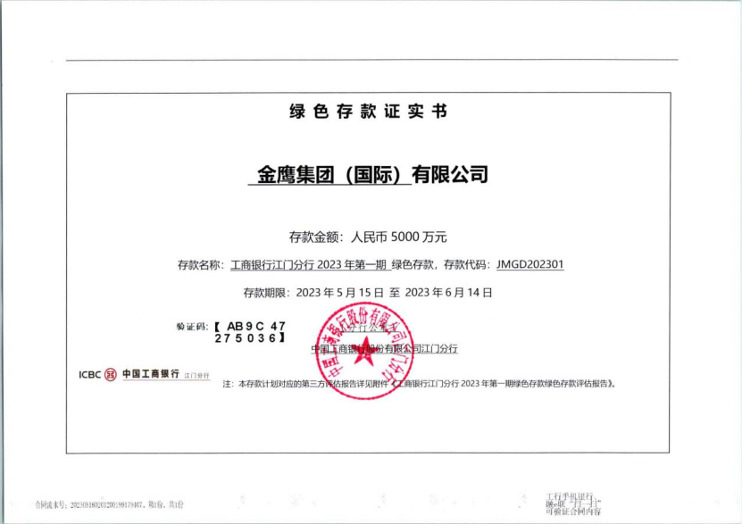 根據工商銀行江門分行的綠色存款產品計劃書,金鷹集團的綠色存款將主要投放到污水處理類(污水處理及收集)項目、資源綜合利用類(生活垃圾焚燒發電)項目及其他符合規定條件的綠色產業項目。上述項目,均已通過獨立第三方專業認證機構——中誠信綠金科技(北京)有限公司鑒定。此外,工商銀行江門分行每半年定期向金鷹集團提供《綠色存款評估報告》,通過詳細數據追蹤資金使用情況,確保綠色存款專用于綠色項目。