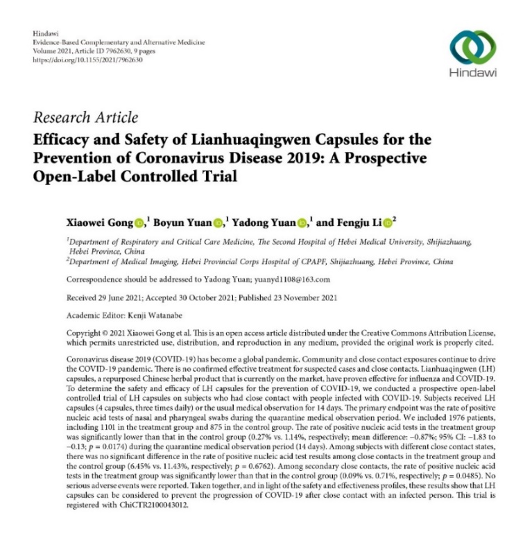 由河北醫科大學第二醫院呼吸與危重癥醫學二科主任袁雅冬教授主持開展的“連花清瘟膠囊預防新型冠狀病毒肺炎”真實世界研究論文被國際學術期刊《循證補充和替代醫學》刊發,該研究選取1976例與新冠肺炎感染者有密切接觸的受試者,分為連花清瘟治療組(1101例)和對照組(875例),兩組受試者分別接受連花清瘟膠囊(4粒/次,3次/天)治療和常規醫學14天觀察,并于14天后檢測鼻咽拭子核酸檢測陽性率。研究結果顯示,隔離醫學觀察期間(14天)治療組核酸檢測陽性率為0.27%,對照組為1.14%;二次密切接觸者中,治療組核酸檢測陽性率為0.09%,對照組為0.71%。服用連花清瘟治療組都顯著低于對照組。在醫學隔離觀察期間,對于核酸檢測陽性患者,連花清瘟治療組的癥狀發生率顯著低于對照組,特別是能顯著降低發熱的發生率。這是首個對新冠密切接觸者預防的有效性和安全性的臨床試驗。