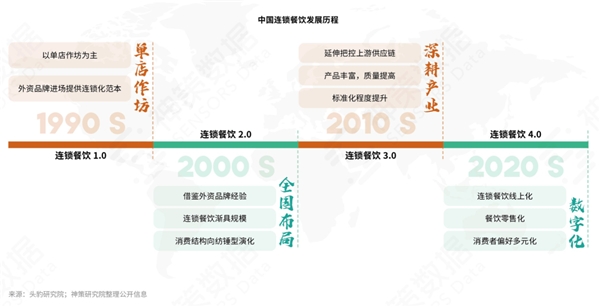 中國連鎖餐飲發展經歷了“單店作坊、全國布局、深耕產業、數字化”四個階段,目前已經進入 4.0 數字化階段,呈現線上化、零售化、消費者偏好多元化的趨勢。