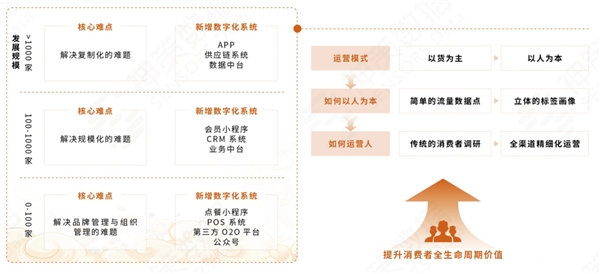 2、在實現消費者全生命周期價值運營時,不同規模的連鎖餐飲品牌需關注不同的重點:小而美的企業聚焦數字化鏈條前端板塊,規模化的企業更聚焦雙中臺的搭建。