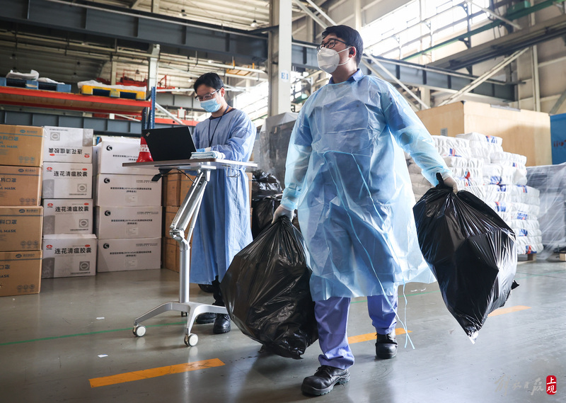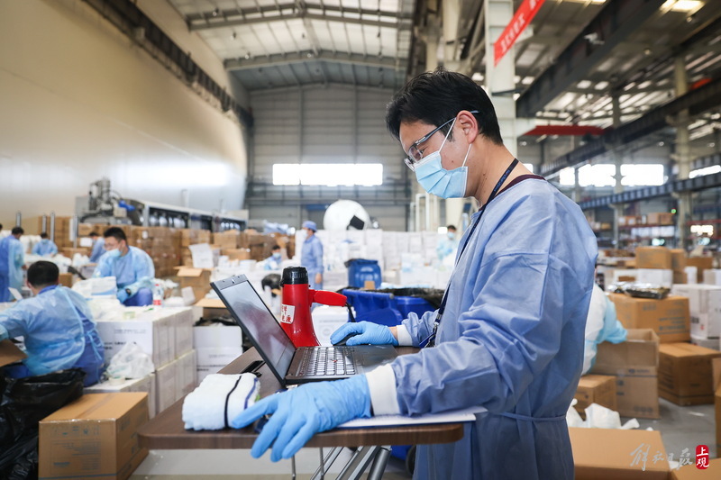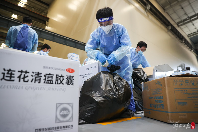 現場負責人楊東告訴記者:“我們是4月6日晚上接收到分裝任務,目前累計打包送出8萬余份‘防疫服務包’,我們從早到晚能快一點就快一點,就想著盡快把物資打包好送到居民手中。”