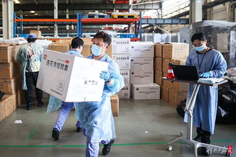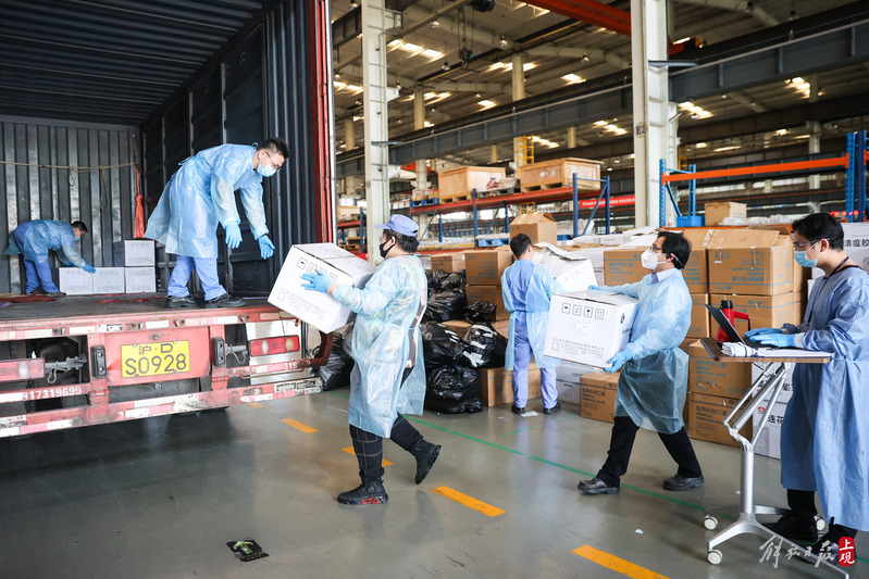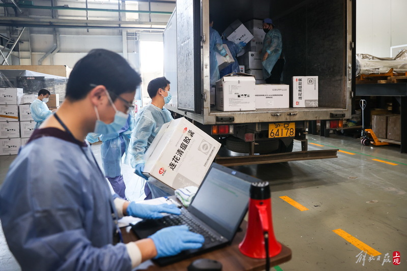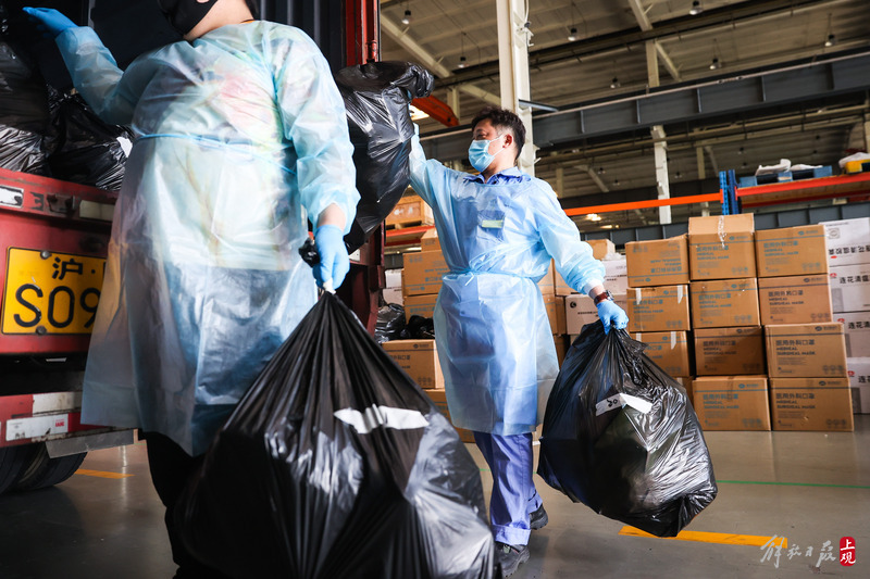為不增加基層負擔,寶山區啟用7個分揀點對應13個街鎮園區,由招募來的企業職工及志愿者流水線作業,對物資開展卸貨、分裝。
