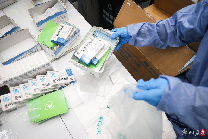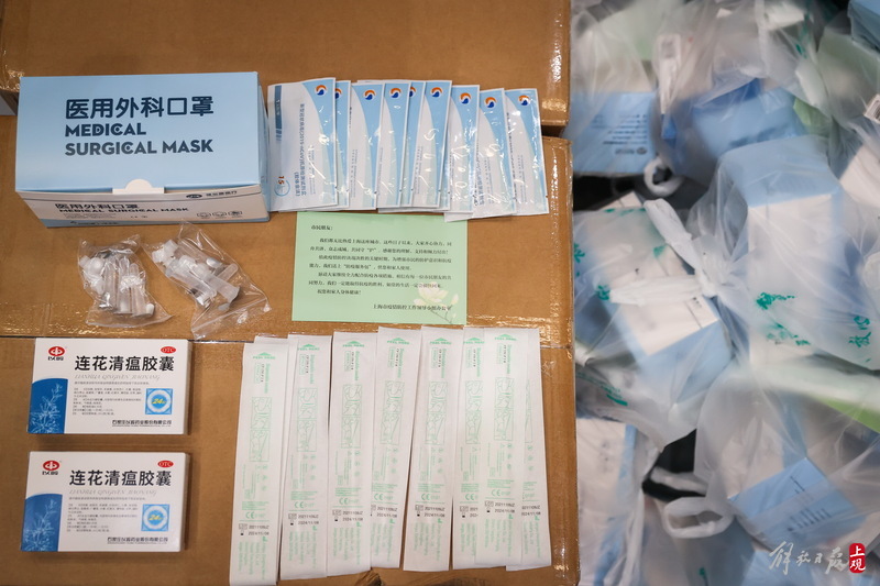 每個服務包內有口罩、連花清瘟膠囊、抗原測試盒,并附有一張上海市疫情防控工作領導小組辦公室的心意卡。