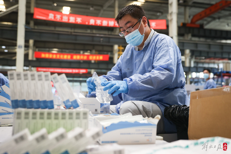 2022年4月11日,上觀新聞記者來到業績路上的寶山防疫服務包最大的分裝車間,這里原本是上海漢虹精密機械有限公司的生產廠房,但該廠百余名志愿者從早上八點就開始分批次投入到了防疫物資的分裝“流水線”作業中,一張張清單核對,一件件物資分裝,現場熱火朝天。